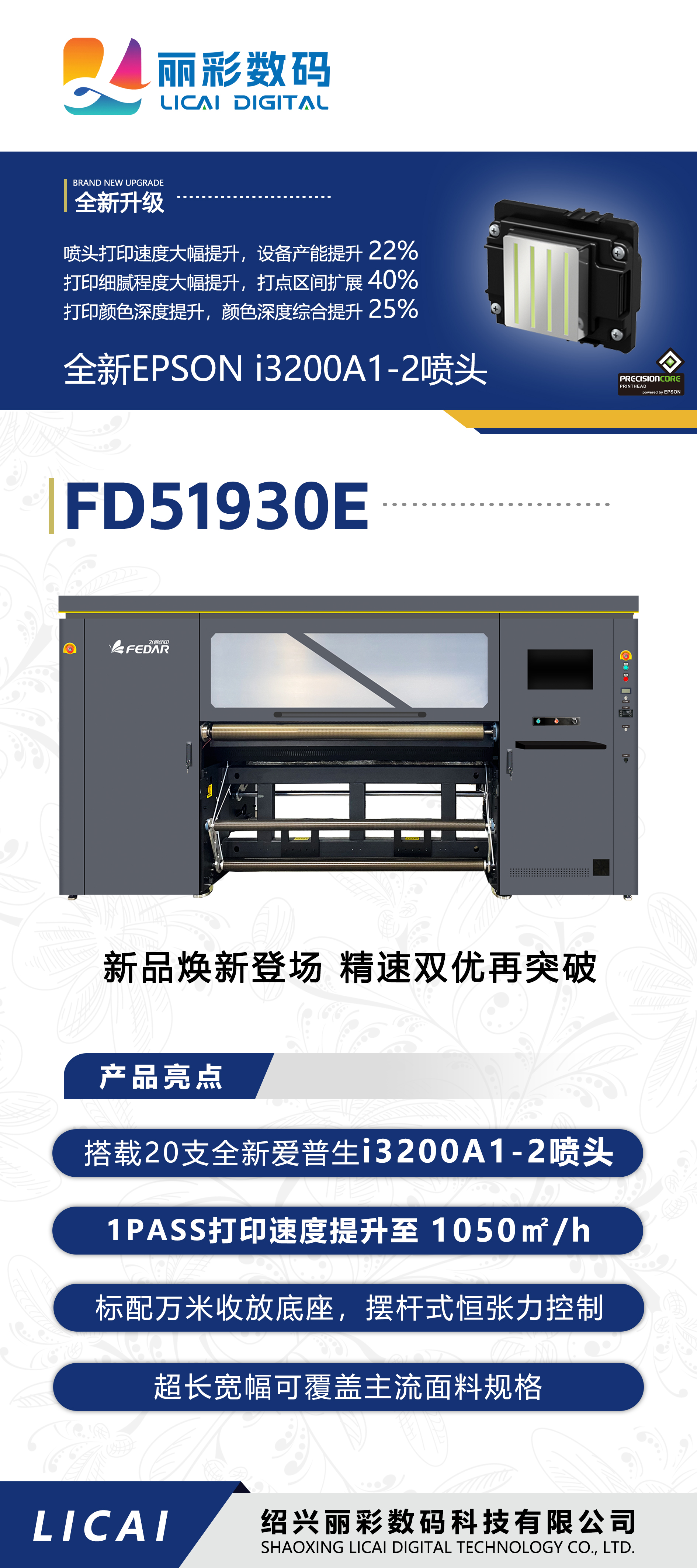 | 标准配置 | 智能烘干系统,集成三色灯报警系统,连续供墨系统,万米收卷,负压装置,磁悬浮电机模组 |